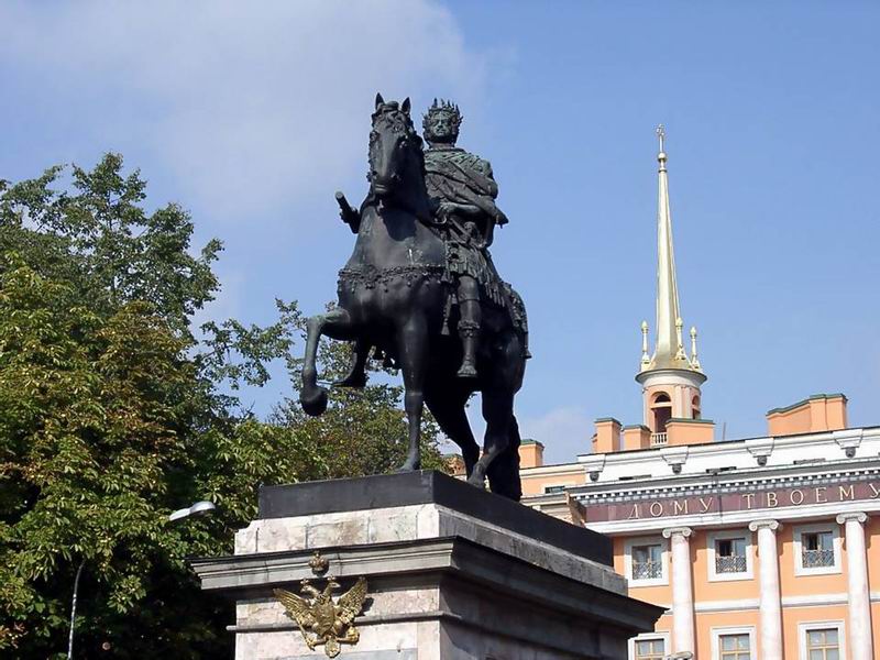 Бронзовый памятник Петру Первому установлен перед Михайловским замком в Санкт – Петербурге. Интересным фактом является то, что изготовление данного скульптурного сооружения происходило при жизни монарха. Над созданием памятника Петру Первому у Михайловского замка трудился известный скульптор Италии